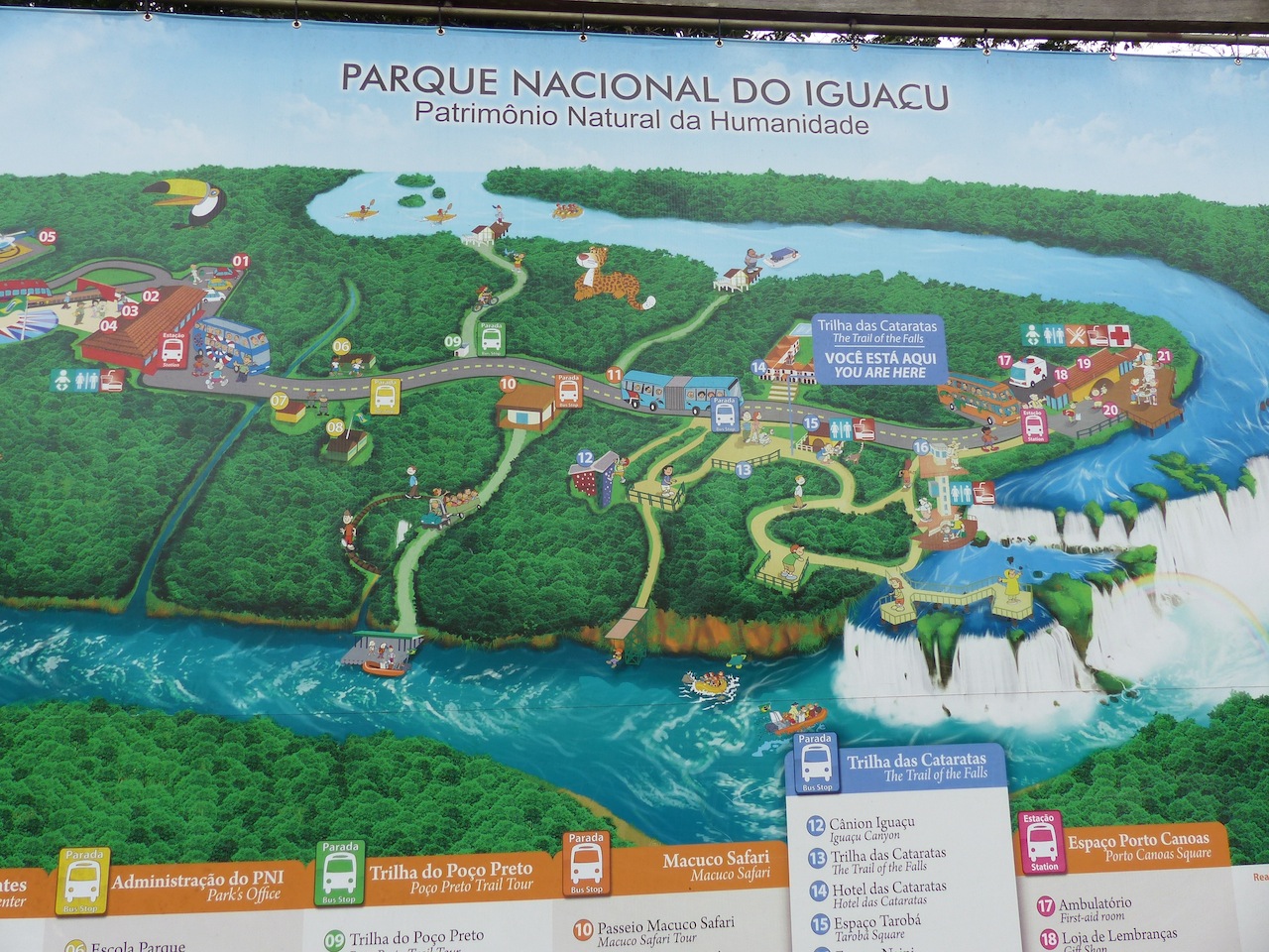 Ce que vous voyez en bleu, rouge et orange en haut sur ce plan sont les passerelles installées pour accéder soit au pied, soit au plus près du haut des chutes….sur 3 kilomètres de large le fleuve Iguacu chute verticalement de 80 mètres et offre un des plus beaux spectacle que la nature peut donner….une rive est Argentine, l'autre Brésilienne….ont peut visiter les deux….en payant deux fois évidemment….Ici il ne s'agit que du coté Argentin….
